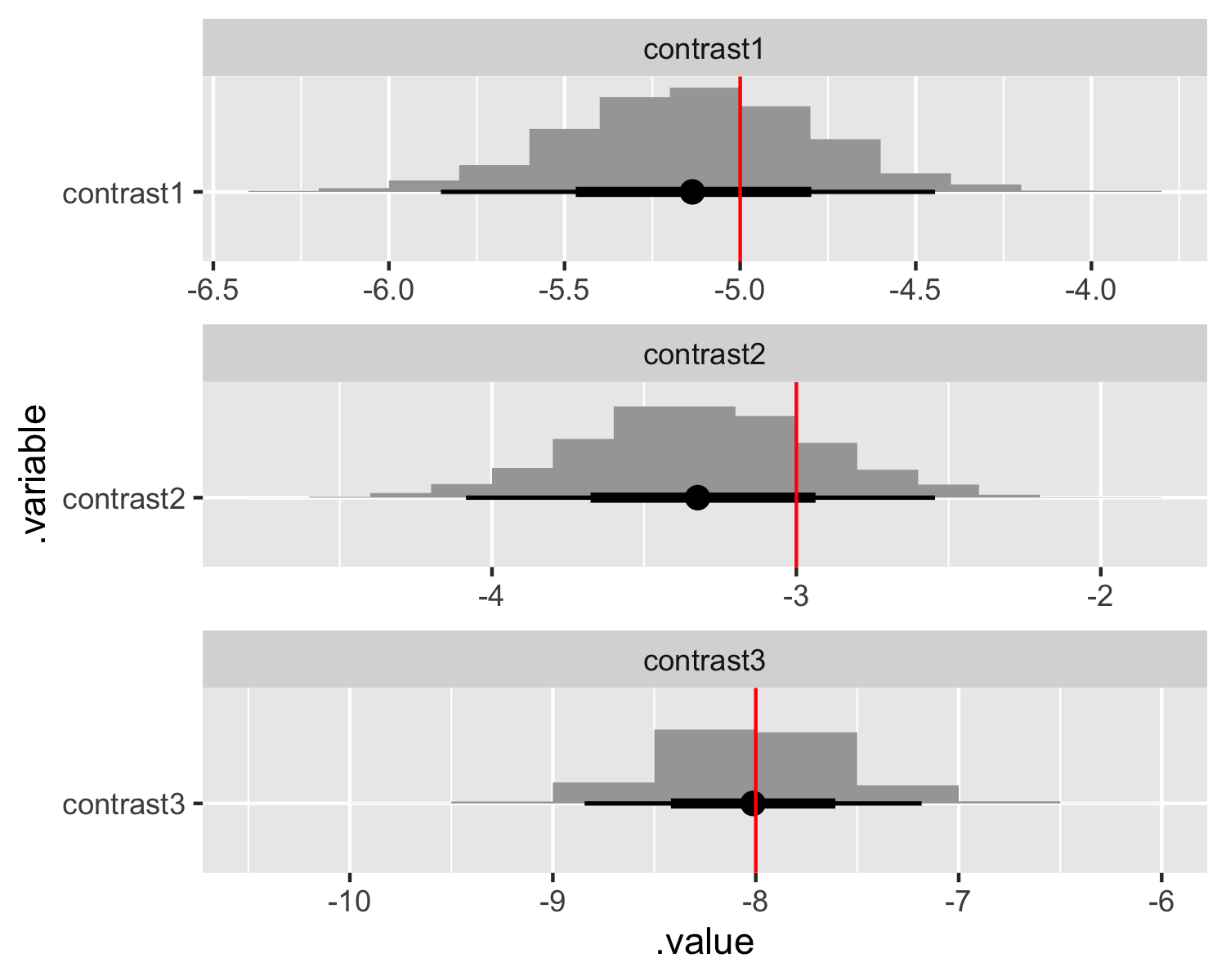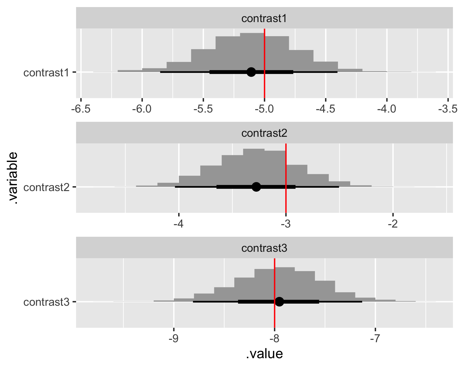 Note that we can’t directly recover the parameters values we used when simulating the data. Dummy coding is equivalent to specifying each included level as a “hard-wired” contrast with the reference level. We can compare the dummy-coded marginal posteriors to the contrasted true parameter values.