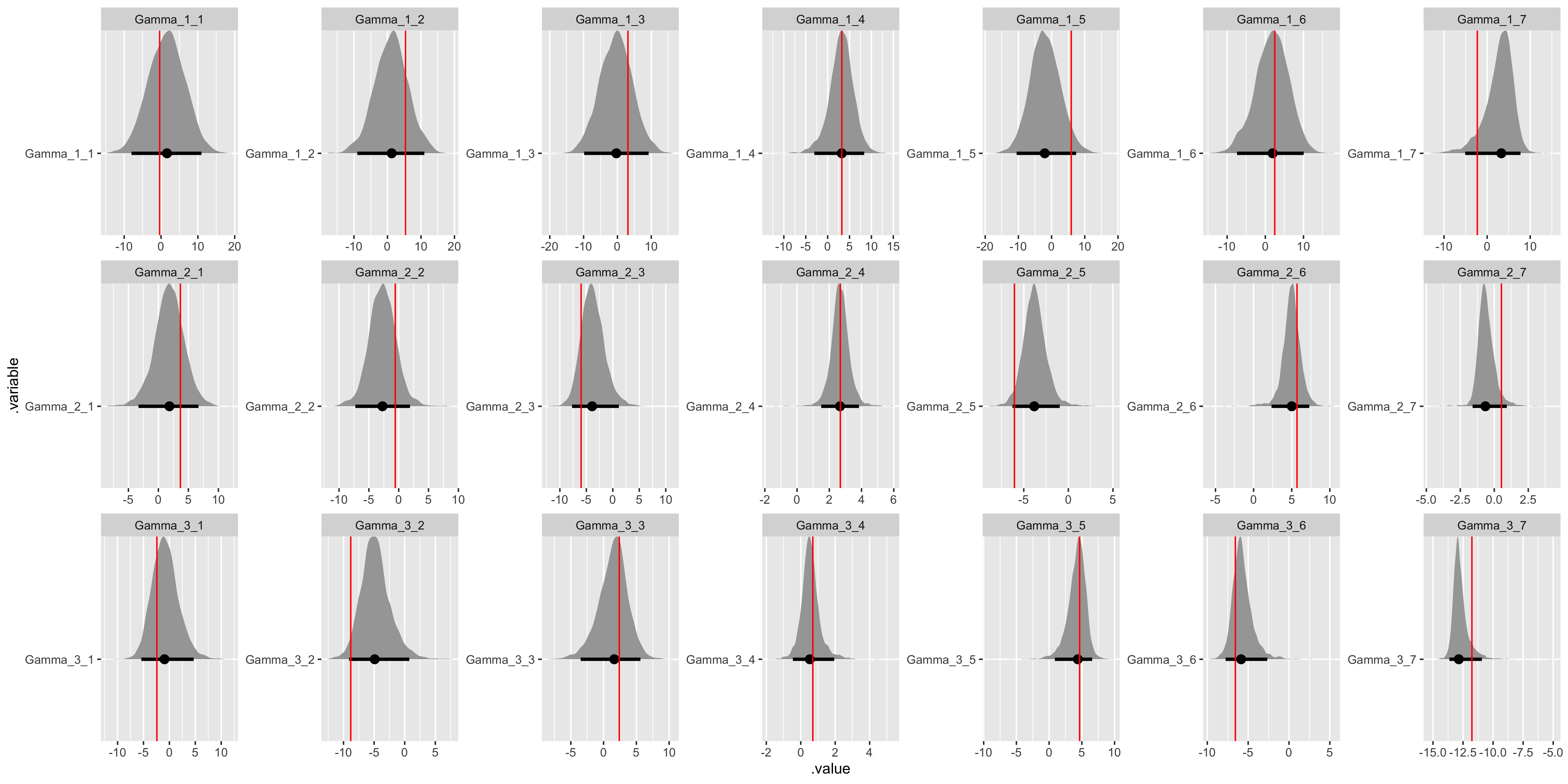 Besides the tau parameters (and variances can be notoriously difficult) we have good convergence and model recovery. To summarize, we have now specified a hierarchical linear model with a multivariate upper-level, generated data according to that model, and used the generated data to demonstrate that the model is working by employing a non-centered parameterization.