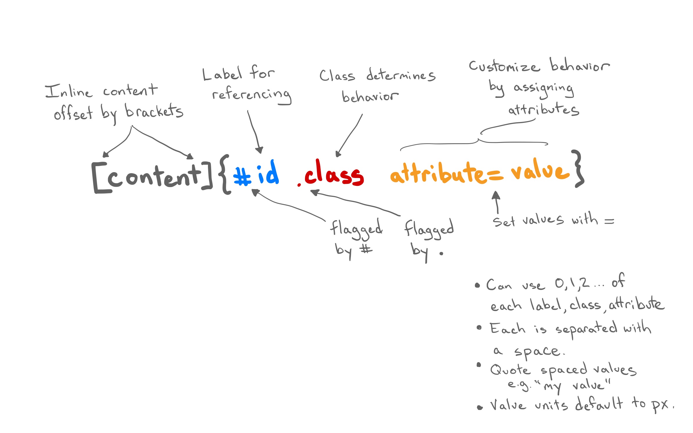 Spans (or Bracketed Spans) work similarly, but are used to format in-line elements.
