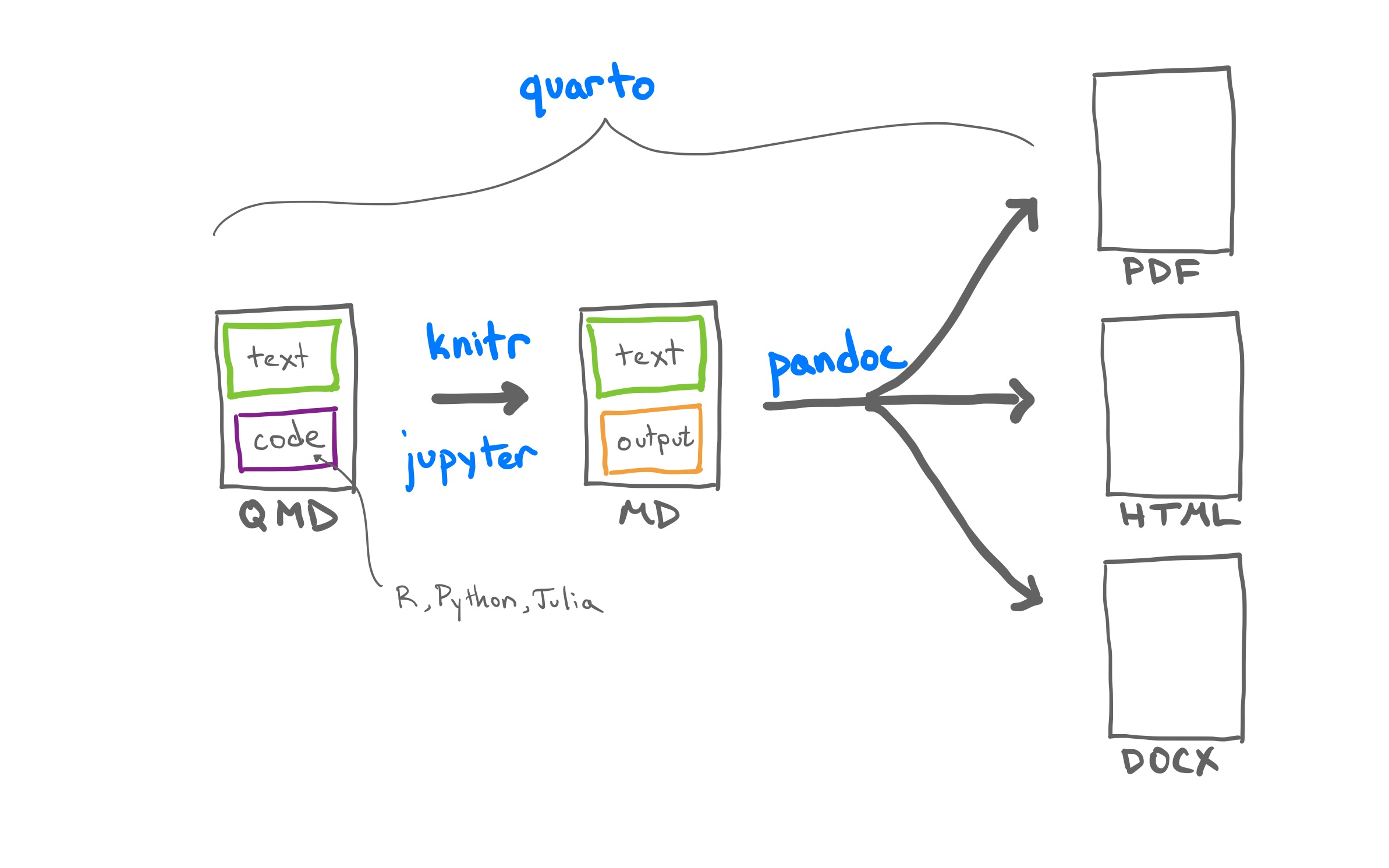 A Quarto .qmd file on the other hand can be composed of text and R, Python, and/or Julia code. Either the knitr or jupyter engines will then render your text and code into a Markdown file followed by Pandoc producing whatever output you’ve specified.